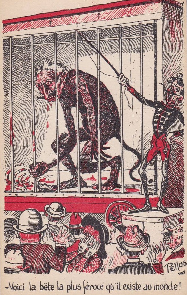 . En voici une qui représente Guillaume II en bête féroce , envoyée le 2 Mars 1919 .