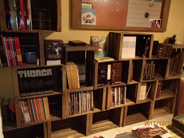 Pour ta deuxième remarque, c'est "volontaire" ... même les caisses vides sans les BDs avaient déjà cet effet... car toutes les caisses ne sont pas forcément identiques (il peut y avoir une différence d'environ 1 cm sur les mesures...), et je ne me suis pas pris la tête à toutes les trier .. comme par hasard, première rangée du bas j'ai une caisse plus grande d'1 cm par rapport aux autres ... étant donné qu'au dessus c'est en quinconce, le décalage est déjà créé ... je l'ai laissé car j'ai trouvé ça sympa à l'oeil. Le jour où je devrais en rajouter, j'irai même jusqu'à en mettre position losange. Aprés, dès que tu les fixes entre elles, plus rien ne bouge.