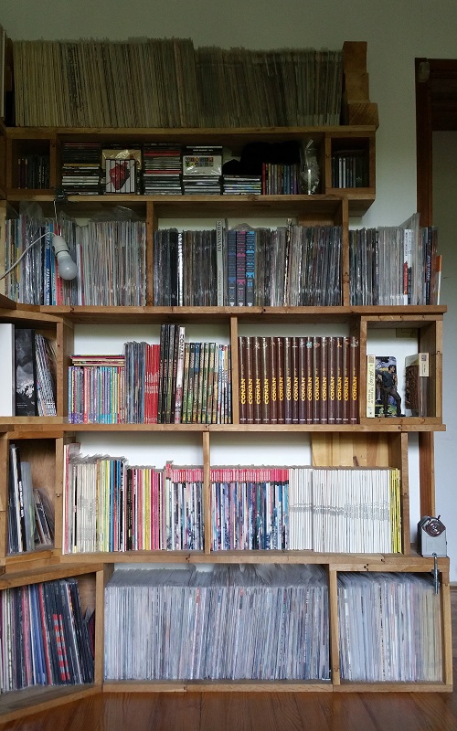 - A l'étage dans la chambre, 1 étagère "sur mesure" amovible qui a été faite en même temps qu'un dressing dont elle forme le coin. J'y stocke mes comics hard cover VF et VO :
