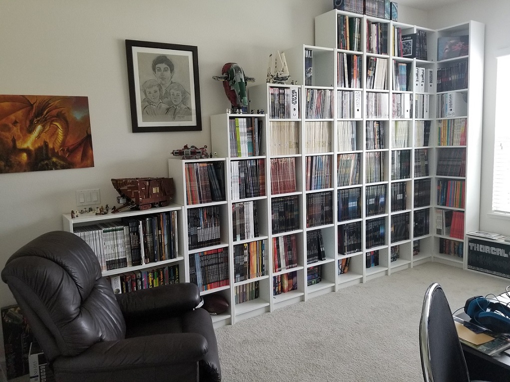 pour moi c'est en partie lié à la nature de la collection. si on a une majorité de francobelge en format classique et beaucoup de longues séries classiques, un classement par série, ou héros, est envisageable. si on a une collection beaucoup plus hétéroclite (manga + comics + one shots + séries courtes + intégrales etc ) je préconise un classement par format / collections / éditeurs, qui permet d'optimiser la hauteur des étagères pour les mangas et moyens formats.