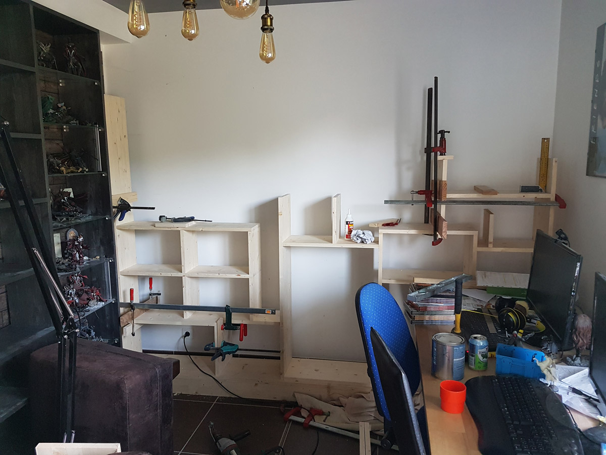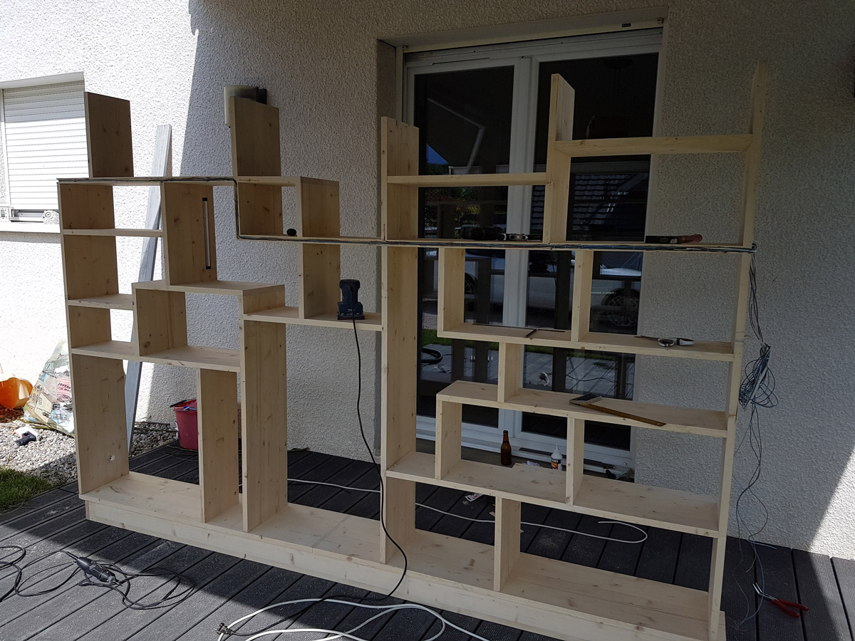 Juste une question: vu le nombre de montants verticaux (pléonasme?) au complet ininterrompu fort réduit (je n'en vois possiblement qu'un seul à gauche sur la photo), est ce que le meuble prend vraiment appuis sur les murs latéraux (et p-ê même contre le plafond)?