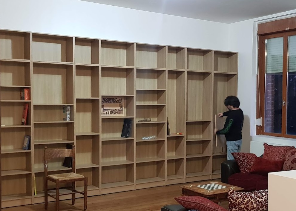 je vais rajouter aussi 3.60 m de rayonnages pour les vinyles et les CD, avec 2 séries de caissons bas, pour séparer l'espace bibli et l'atelier loisirs créatifs de madame Bou.