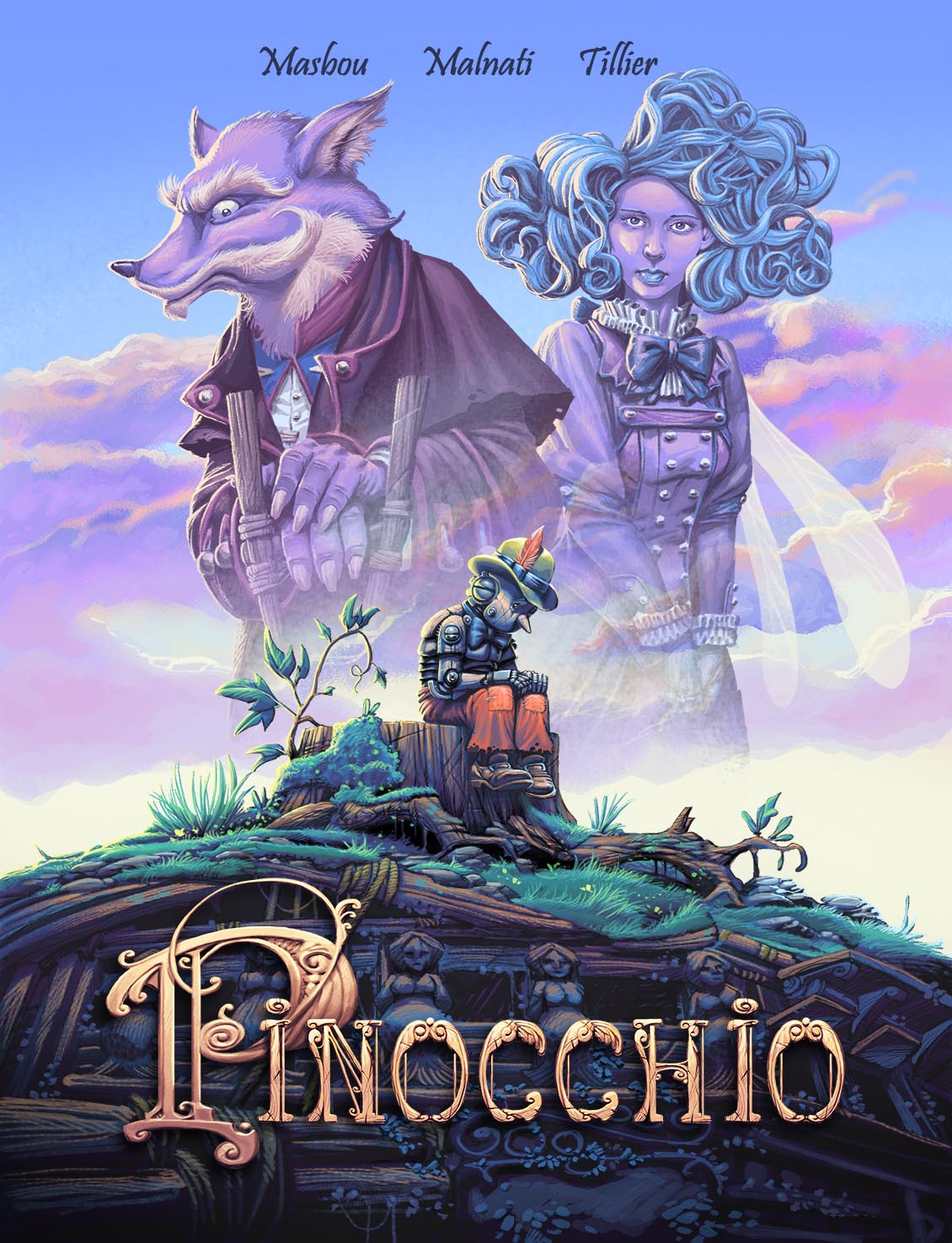 Pour Pinocchio je finis les encrages ce mois-ci, j'en suis très content ! Je fais des tests de couleurs pour la partie "présent" du récit. Il y a le présent où Pinocchio raconte son histoire, et le passé, c'est à dire l'histoire de Pinocchio.