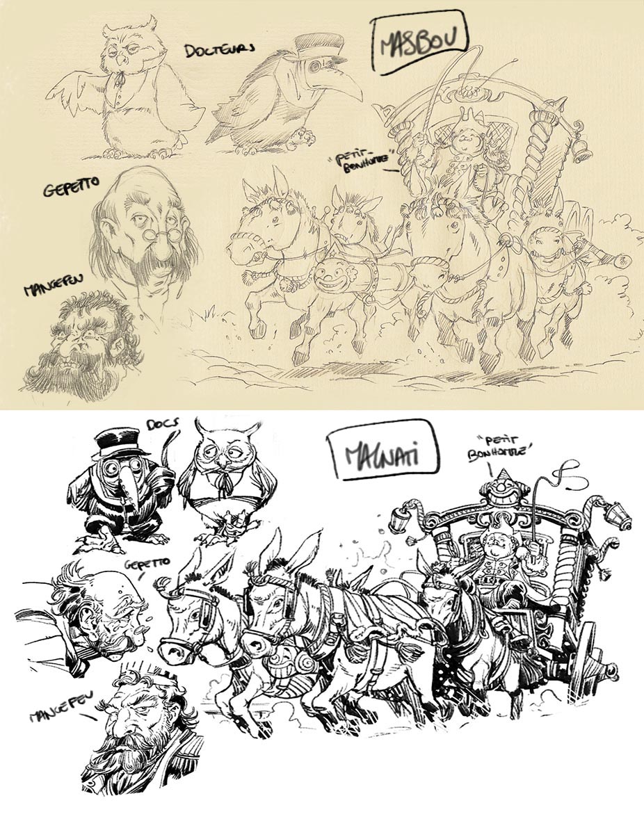 Elle respecte en partie la narration en Z, parce que les cases renvoient par leur dynamique interne à la case suivante, et elle respecte la règle des 180°, parce que la fée est toujours à gauche du miroir, dans toute la séquence, et Mangefeu (le gros barbu) est toujours à droite des marionnettes.