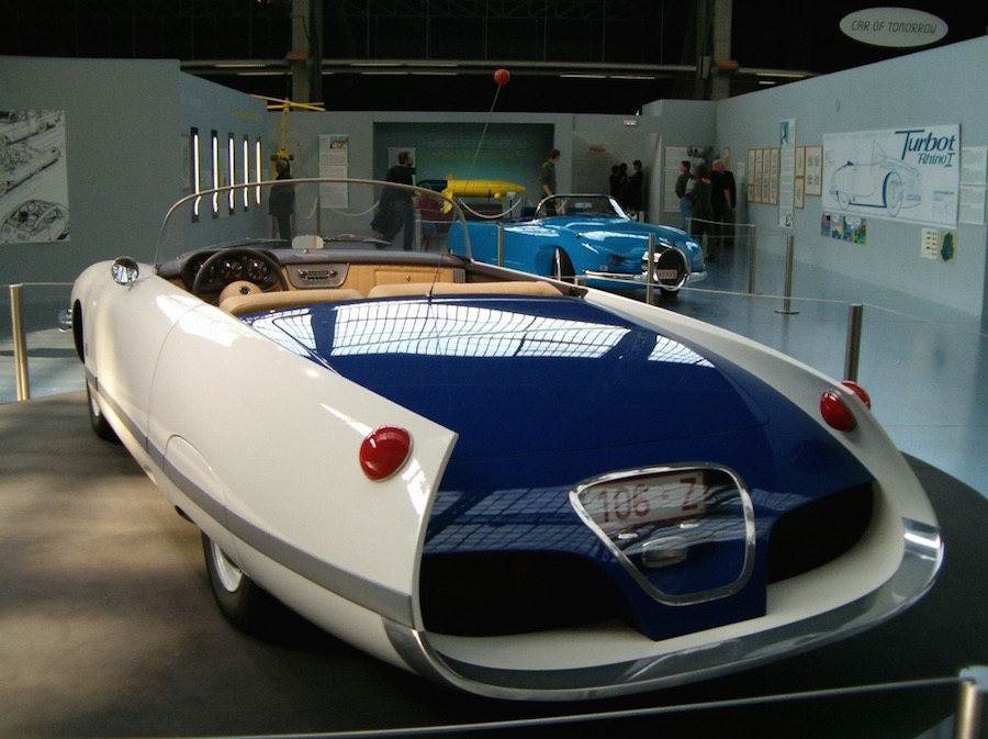 MAIS la Turbot 1 a été réalisée en vrai, en 2004 je crois, par le carrossier suisse (bien connu des spécialistes) F. Sbarro; c'est un véhicule parfaitement roulant (à moteur... Citroën V6 !...), dont le dessin a dû être légèrement adapté aux fameuses contraintes techniques !
