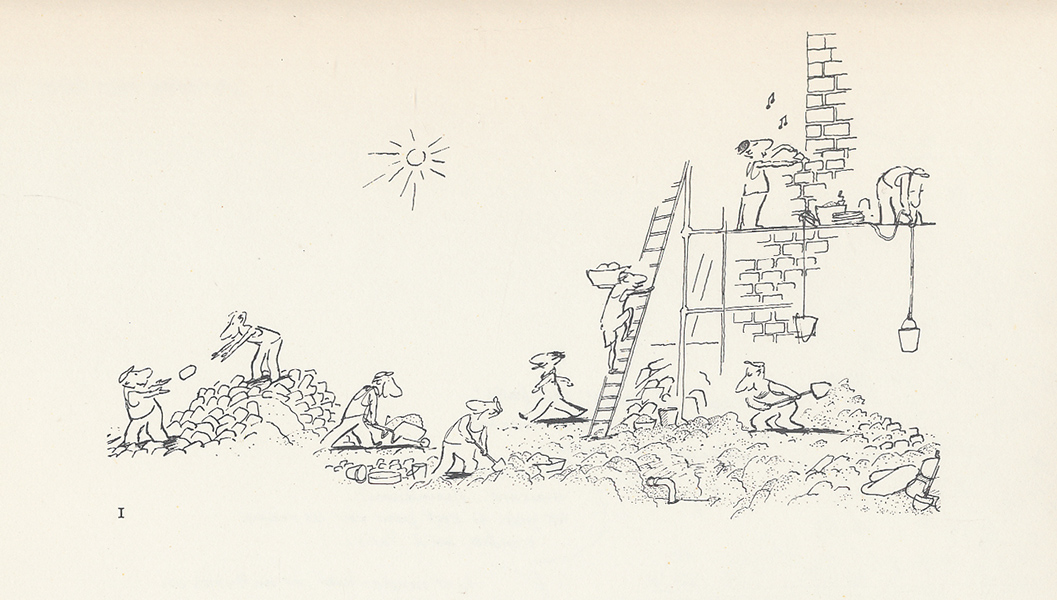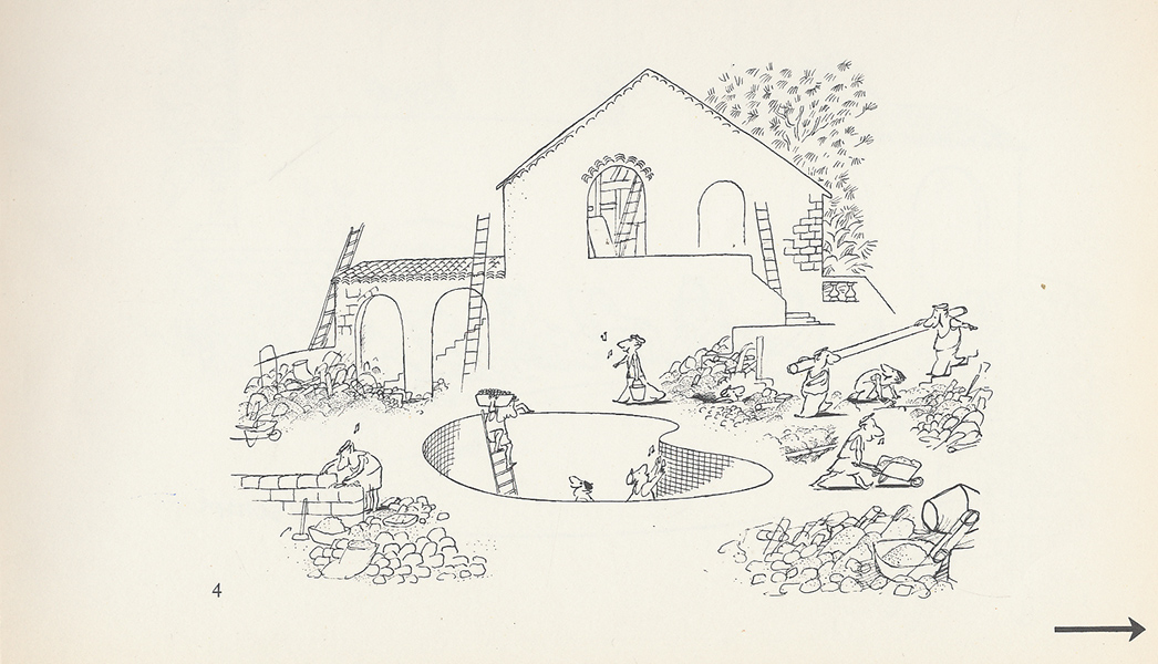 premier bande : un important groupe d'ouvrier construit une grande piscine de luxe dans la joie et la bonne humeur, ça sifflote ça rigole en bossant, ça boit un coup...![]()