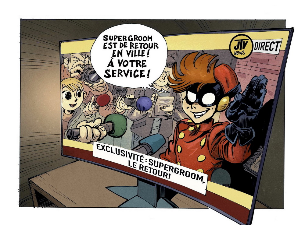 SuperGroom est le nouveau superhéros européen qui fait le buzz et de nombreux émules. Mais derrière ce mystérieux personnage héroïque se cache Spirou, l'aventurier, qui, suite à un coup de pub raté, s'est retrouvé prisonnier de cette nouvelle identité.