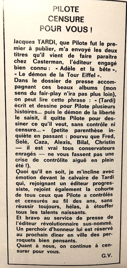 Jopo de Pojo a écrit:Tiens, une petite curiosité concernant le passage de Tardi de Dargaud à Casterman, en 1976, avec les deux premiers Adèle. Apparemment, Guy Vidal, rédac-chef de "Pilote" (qui appartenait à Dargaud) n'a pas apprécié certains commentaires de Tardi (qui a toujours critiqué l'ambiance à "Pilote" du temps de Goscinny). Voilà ce que Vidal écrivait dans Pilote mensuel d'août 1976 :