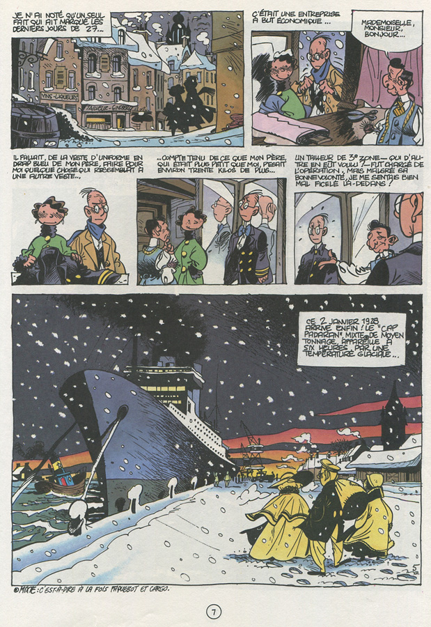 Effectivement, ça change pas mal. Dans ton édition originale, j'avoue préférer la couleur de la ligne de flottaison du bateau, celle du petit bateau qui passe à côté et celle de la mer dans la dernière case. En revanche, je préfère la tonalité du ciel dans le mien. Je précise que mon scan (que j'ai fait moi-même, ce n'est pas une image téléchargée) donne une image plus lumineuse que l'image réelle, mais en faisant une comparaison directe album-écran (en tout cas, le mien) les couleurs et les valeurs sont respectées.Alexander a écrit:Pour être complet au sujet de la planche 5, j’ai fait un scan de celle de l’album éo (ma reliure), j'ai des variations importantes par rapport à celle que tu as postée.