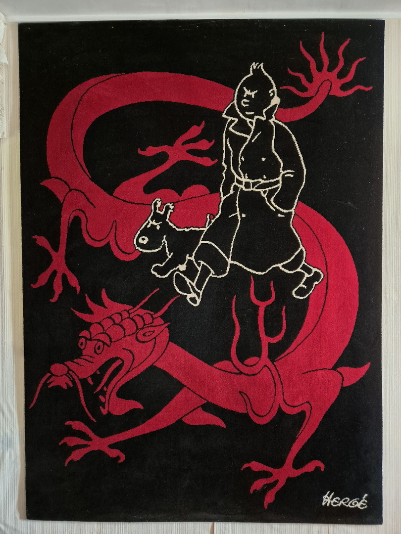 Tapis en laine Axis en parfait état figurant Tintin et Milou sur le dragon, France 1996. Dimensions : 165 x 230 cm. Extrêmement décoratif en exposition murale.