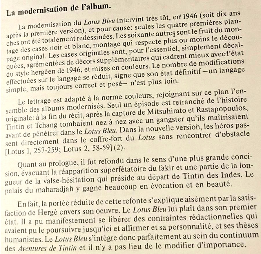 - La re-colorisation telle que proposée pour le Lotus, avec des choix discutables, qui ne respectent pas l'œuvre originale ni la vision d'Hergé, plus basés sur des considérations marketing. Et surtout on est en disharmonie totale avec Chez les Soviet, donc on n'est même pas dans l'optique de l'unité, l'uniformisation graphique d'une collection. On a l'impression que ca a été fait par deux studios différents.