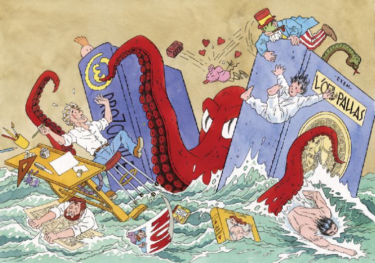 La présence de Mortimer souligne l'importance de l'œuvre d'E.P. Jacobs dans son univers tandis que la grande pieuvre, qui révélait initialement une grosse influence de Tardi, est devenue maintenant une sorte de logo d'Exem à Genève. Ce dernier a en effet créé un grand nombre d'affiches qui contenaient souvent une grande pieuvre et cet animal représentait bien sûr le mal au service des puissants. La présence de Little Nemo (de Winsor McCay) et de Krazy Kat (de Herriman) révèle sinon son admiration éperdue pour ces deux dessinateurs tandis que la tête de Tintin est volontairement masquée par le titre de TdB et par un gros recueil de la revue Drozophile, où Exem a régulièrement publié des pastiche de Blake et Mortimer. Et enfin, le dessinateur qui tombe à la renverse est bien sûr Exem lui-même, aujourd'hui débordé par tout ce qu'il a créé depuis 40 ans. Il y a encore Tarzan qui s'enfuit et de multiples petits détails sur lesquels je ne m'attarderai pas ... mais qui ont de l'importance pour le dessinateur.