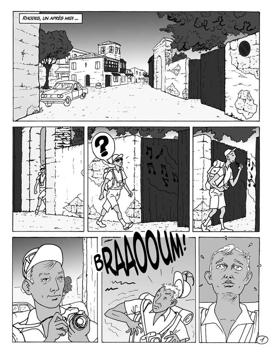 Voici un "sketch" dessiné pour un collectif d'amateurs. J'ai commencé la mise en couleurs de la planche 1 avec Photoshop. Je la poste en niveau de gris, car le recueil est prévu en noir & blanc.