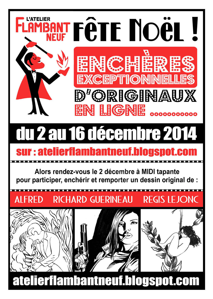 Les membres de l'atelier flambant neuf, Alfred, Richard Guérineau et Régis Lejonc, ont créé un blog pour organiser une vente aux enchères en ligne de 15 dessins originaux!