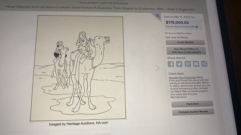 Oui, acheté chez HB à l'époque où ils étaient encore Bld Lemmonier. Ils avaient ça et une belle Blueberry du spectre vers la fin dans l'arrivée à la mesa. Le prix était quasi le même: 3k pour le dessin de Tintin, 3.5 pour la Blueb. J'étais parti sur le dessin, dont la finition était pour moi du Hergé. Finalement la fondation a refusé, je l'ai revendu qlq années plus tard pour ce qu'il était: un dessin Studio, au même prix, de manière transparente.