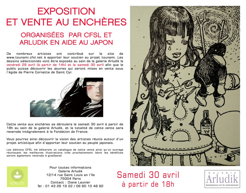 Grande vente caritative en faveur du japon qui aura lieu le 30 Avril à 18h, à la galerie Arludik à Paris.L'Initiative #Tsunami est lancée par la communauté CFSL, conjointement avec Jean David Morvan et Sylvain Runberg. Quelques visuels :