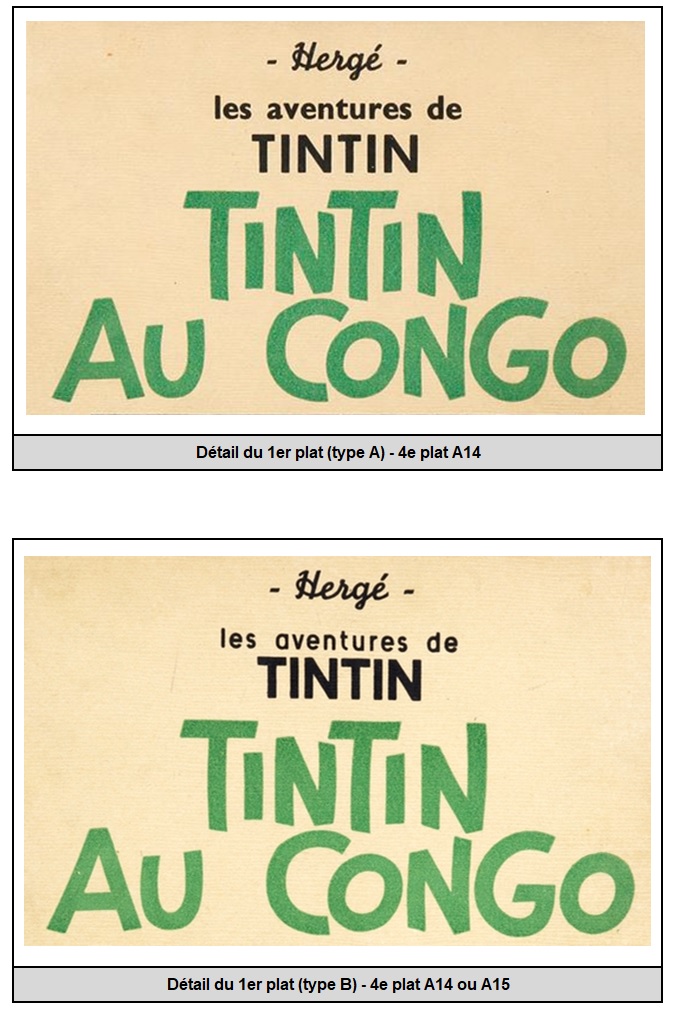 tarente a écrit:En complément de tes infos sur le Tintin au Congo quelques observations que j’avais noté au niveau du 1er plat et qui me semblent intéressantes concernant plus particulièrement les albums avec un 4e plat A14 ou A15.