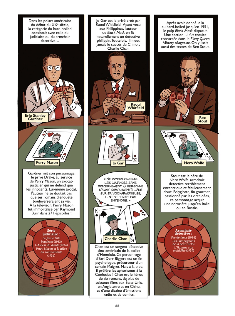 SK : Les chapitres du roman noir ont été extrêmement compliqués. On s'est vraiment pris la tête pour les construire. Il y avait énormément d'auteurs et de références et il fallait pas que ce soit rébarbatif. Cette scène de poker introduit en fait les auteurs et leur bibliographie dans les jetons de poker et leurs personnages, dans les cartes du jeu. Ce genre de case a l'air simple mais s’est révélé compliquée à construire finalement.
