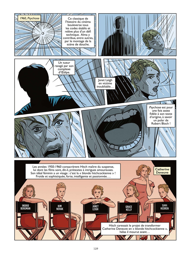 Ajouter un élément incongru dans une scène a toujours un sens, rien n’a été laissé au hasard. Ce sont autant d’indices pour les amateurs du genre, les spécialistes de tel ou tel auteur ou encore des indices pour que le lecteur ou la lectrice mène son enquête ! Chez Hitchcock, à la page 133, j’ai demandé à Sandrine d’insérer Le Cri de Munch pour indiquer en quoi ce tableau est une référence importante pour le cinéaste (ce que j’ai lu lors de mes recherches) et faire écho à la page 124 et 129. Et si on regarde à la loupe, la double page 133-134 est truffée d’indices…