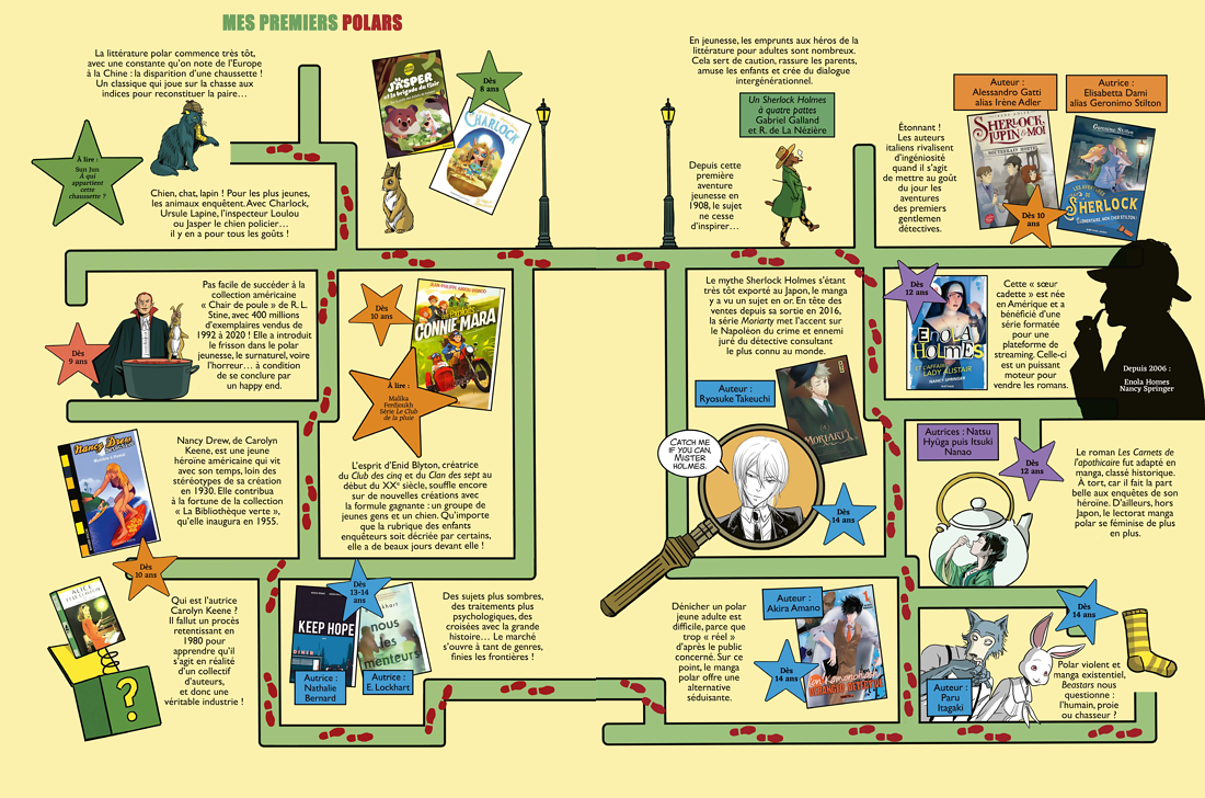 Le Polar de Claire Caland et Sandrine Kerion (Les humanoïdes associés) reste éloigné du catalogue de type Ce qu’il vous faut avoir lu ou de la compilation de fiches souvent rébarbative. Bien sûr, le livre est un guide qui suggère de découvrir tel auteur, de s’immerger dans une époque ou une autre, de frissonner à la découverte de vilains légendaires ou de saluer la finesse du raisonnement de limiers héroïques. Mais pas que. La présentation fait que le lecteur se voit aussi offrir la possibilité de s’amuser en inspectant les scènes illustrant les incontournables du genre.