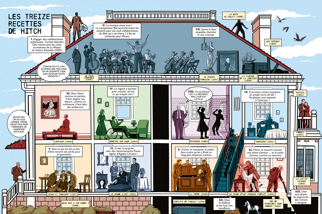 SK : Oui, voilà, c'est ça. L'idée c'était pas juste de mettre une bibliographie à la fin de chaque chapitre, mais plutôt de l'inclure dans la composition de la page ou de la case. Soit l'insérer dans un élément du décor, soit vraiment jouer pour la rendre visible. Qu'elle soit intégrée dans le décor. Elle peut être soulignée par une petite loupe, ou incluse dans une cheminée par exemple. Pour introduire la filmographie de Hitchcock, on a imaginé une maison présentée en « coupe » pour en voir l’intérieur. Pour le néopolar, des banderoles de manifestations, présentent les bibliographies. C'est le genre d'idée née en discutant ensemble.