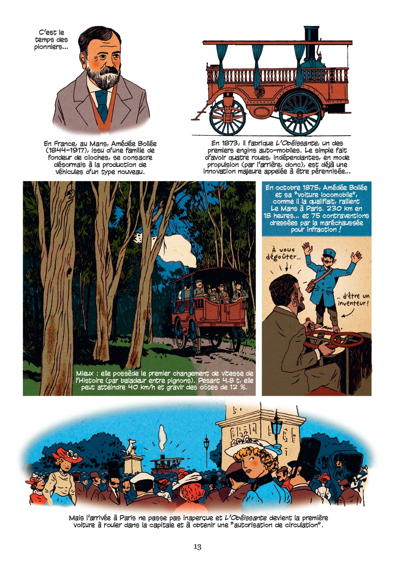 LFB : Oui. Aborder une BD de 400 pages ne m’effraie plus, je sais que c’est deux ou trois ans de travail. La Bombe est un roman graphique, basé sur des faits exacts, mais avec une dimension romancée. Pour L’histoire de l’automobile, la volonté est didactique, presque universitaire. La part d’invention est réduite.