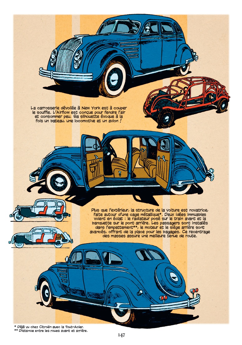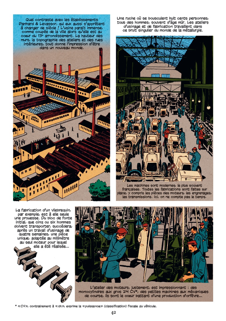 LFB : À la base, il y avait un projet confié par Les Arènes à Jean-Louis Loubet, universitaire, professeur d’économie, spécialiste de l’histoire industrielle. Il avait déjà écrit de nombreux ouvrages sur Renault, Peugeot, et sur l’histoire industrielle de la France. Il a réalisé une synthèse de ses travaux, un document interne rappelant les étapes fondamentales des marques, des modèles, des progrès sociaux et des avancées technologiques. Cette synthèse représentait environ 150 pages. Pour en faire une bande dessinée, il fallait un scénario, un découpage, un rythme, des dialogues. Nous étions donc complémentaires. J’ai adapté cette somme de départ, en réordonnançant certaines séquences, sans rien changer au contenu.