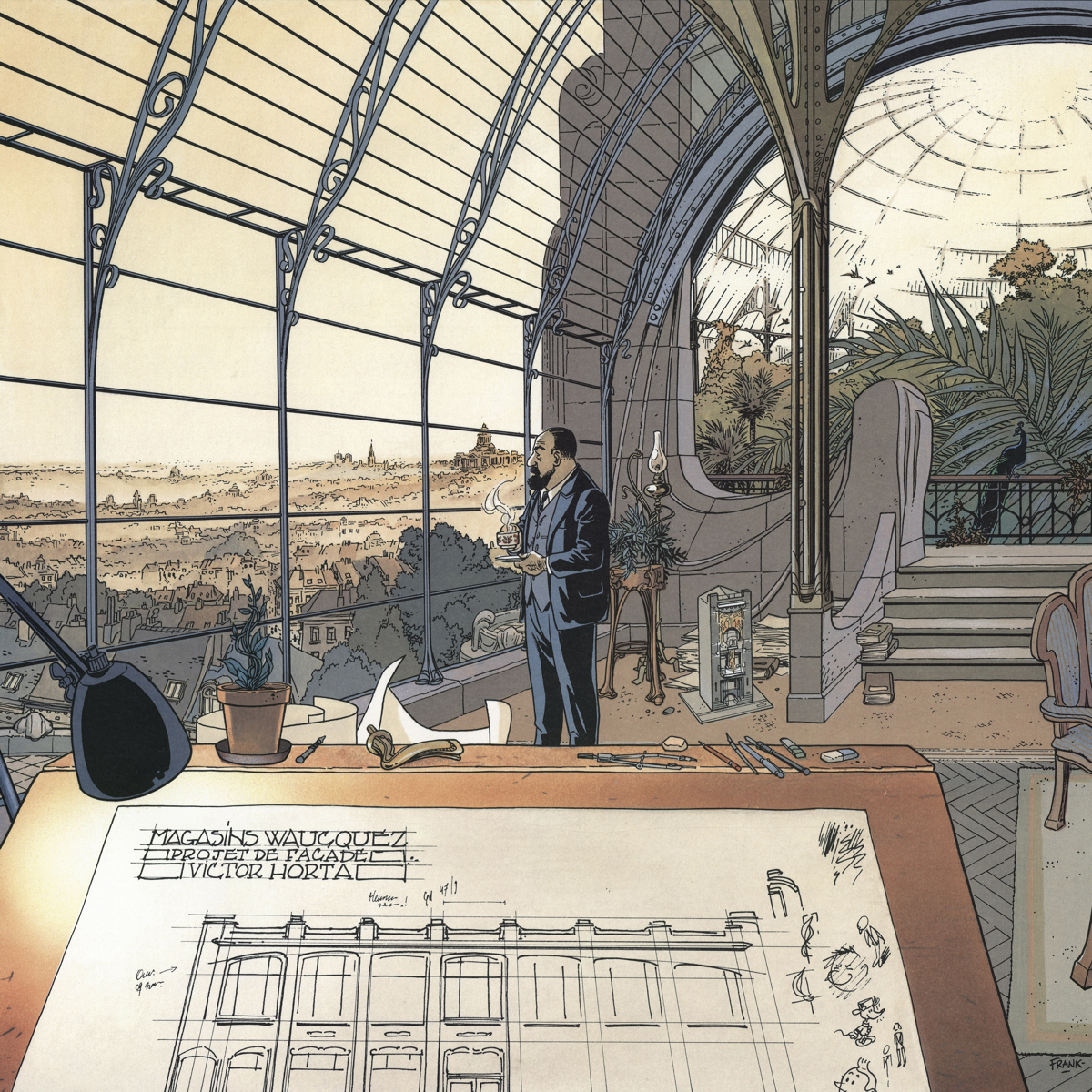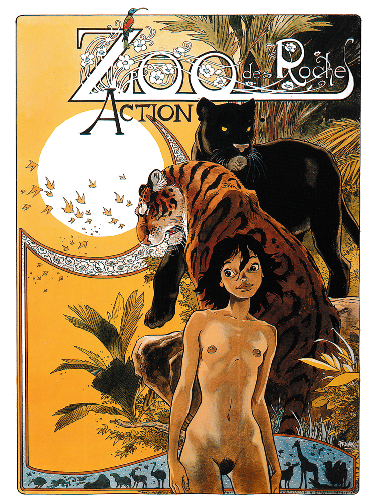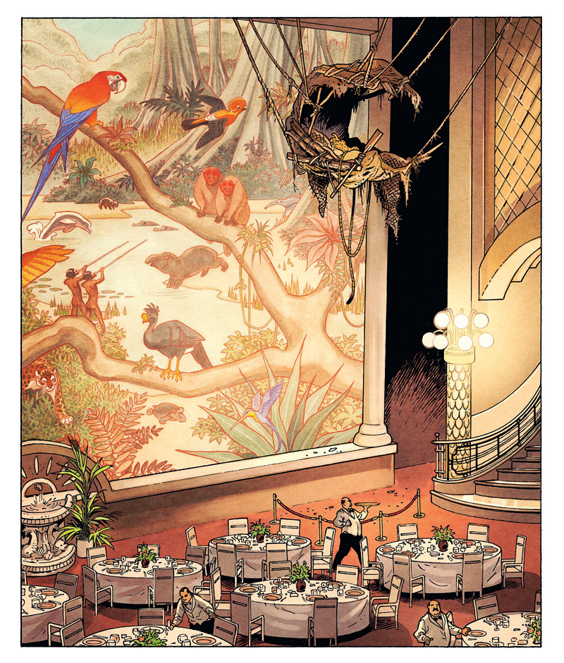 Ce sentiment, ces sensations, je les avais déjà ressenties à la lecture des baleines publiques qui est lui aussi un album incroyable. Déjà, des compositions architecturales enchanteresses qui deviendront l’une de ses marques de fabrique. Frank Pé s’est révélé un architecte de bande dessinée hors-pair. L’art nouveau esquissé dans ses premières compositions va ensuite exploser dans ses œuvres ultérieures. Je pense bien entendu à Zoo, mais aussi plus récemment et de manière plus subtile dans La bête, sa vision du Marsupilami. Et comment ne pas citer le zooïsme, ce courant artistique qu’il a lui-même inventé pour les besoins de son Spirou. Après l’art nouveau puis l’art déco, le zooïsme !
