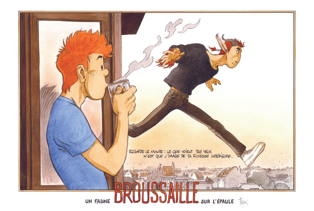 Un faune sur l’épaule est un album plus cryptique, qui me fut plus ardu à aborder, à appréhender, mais que j’ai appris à lire et à relire avec mon émotionnel et qui a dès lors resplendi dans toutes ses dimensions. Je crois que c’est cela, ma façon de lire une planche ou même une illustration de Frank Pé. Je ne la visualise plus uniquement avec mes yeux, je ne suis plus un lecteur qui parcours des images et lis des textes, je ressens. Rares sont les auteurs que j’ai pu apprécier à ce point, qui m’ont procuré un effet de lecture qui n’est pas simplement un plaisir, mais qui me font vivre des émotions.