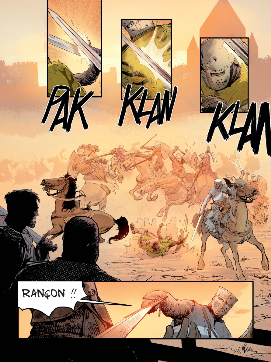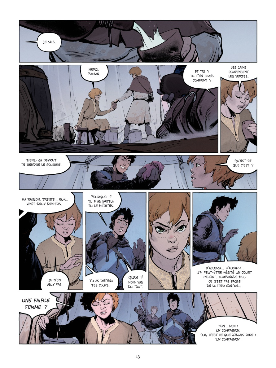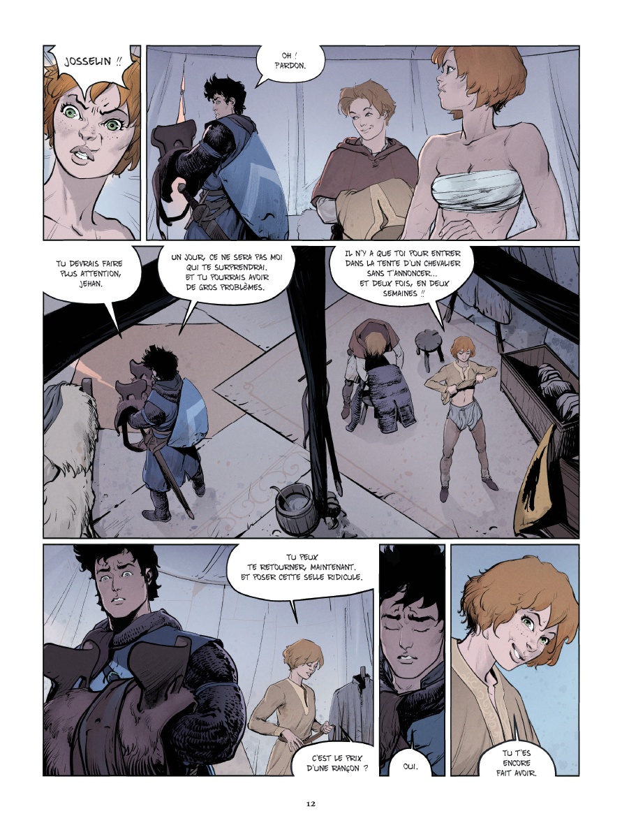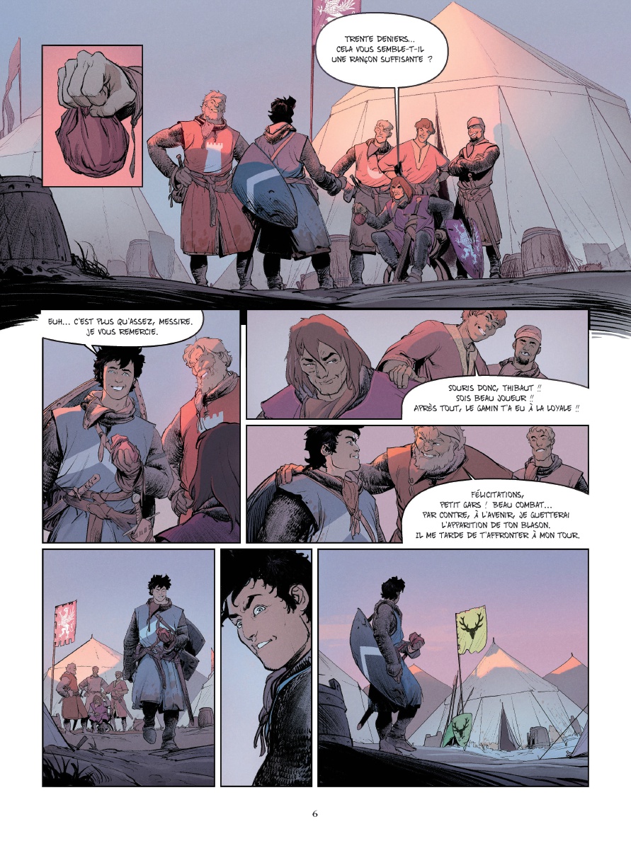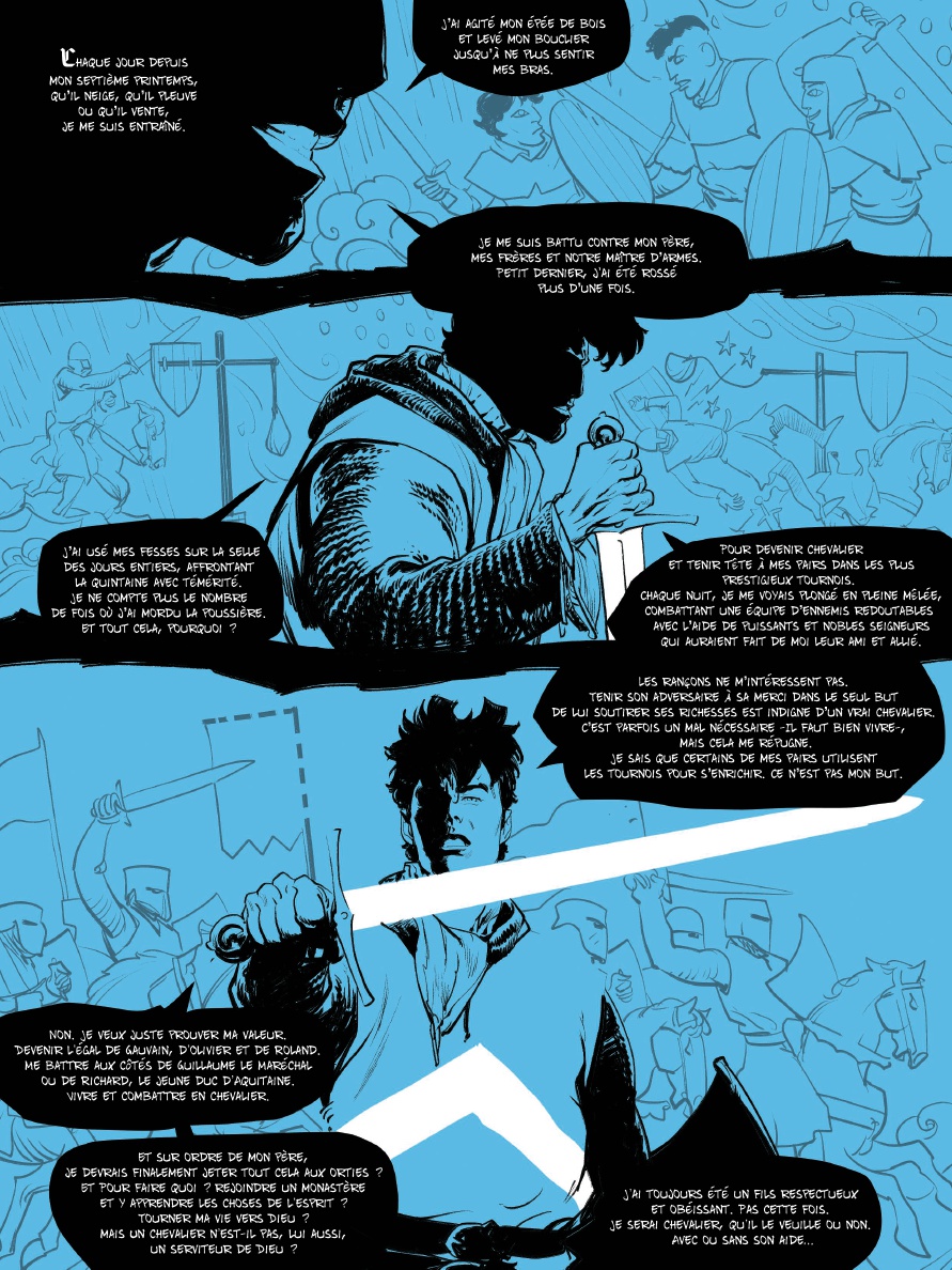 J osselin et Jehan sont deux chevaliers errants. De tournoi en tournoi, qu'il pleuve ou qu'il vente, ils tentent de gagner leur vie en triomphant de leur adversaire du jour. Paulin, l'écuyer de Jehan, les accompagne. Malin et débrouillard, il se révèle d'une aide précieuse.Ils sont en quête de fortune et de gloire, comme tant d'autres. Cependant, il y a tout de même un détail qui les distingue : sous le haubert, Jehan se révèle être une jeune femme... Josselin, lui, rêve de défaire le Chevalier Noirci, un combattant anonyme qui ne retire jamais son heaume, fait bande à part et ne connaît pas la défaite.À l'occasion d'un tournoi organisé par le comte de Joigny, il espère triompher enfin de lui. Hélas, vaincu et blessé par cet adversaire redoutable, il doit laisser sa place à Jehan. Sera-t-elle de taille à remporter la victoire ?Après Ira Dei et La République du Crâne, Vincent Brugeas et Ronan Toulhoat, associés à Yoann Guillo, nous plongent au coeur de l'univers des tournois et de la chevalerie, revisités avec allégresse et empathie pour les personnages. Entre shônen et récit d'aventure, une vision enlevée et jubilatoire du monde médiéval.