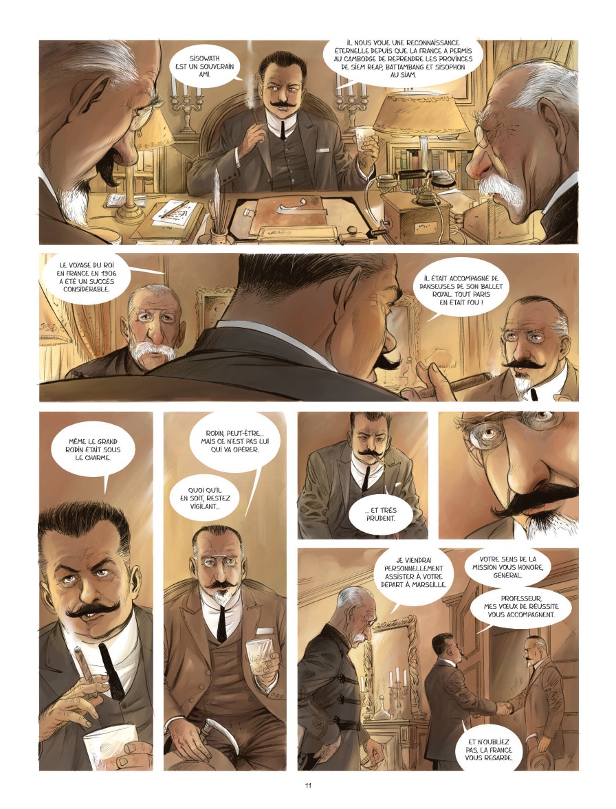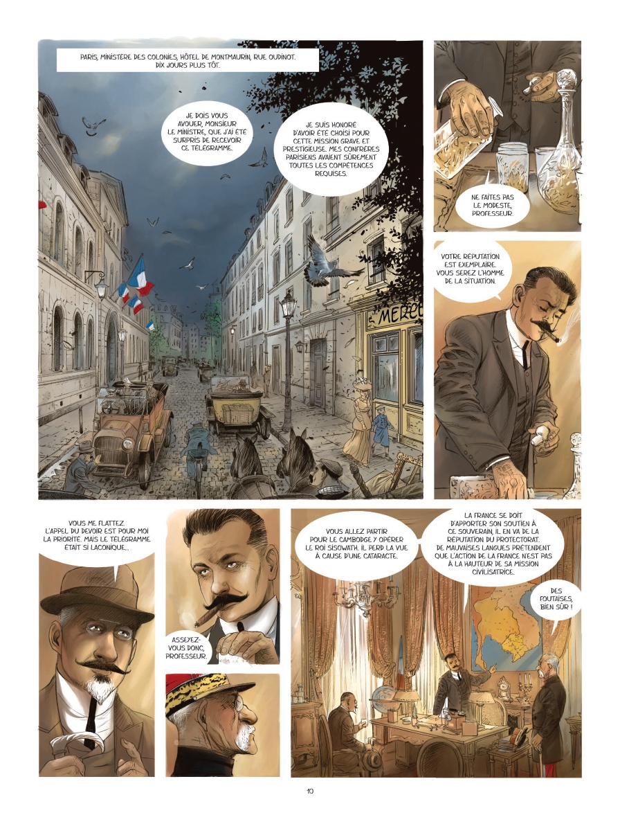 F rance, 1912. Le gouvernement confie au professeur Hermentaire Truc une mission cruciale : opérer le roi Sisowath pour lui rendre la vue et garantir la stabilité du protectorat français sur le Cambodge. Accompagné de son assistant Guerlet, Truc embarque pour Saigon. À leur arrivée, les deux hommes vont de surprises en déconvenues. Ministres comploteurs, bonzes politisés, prince rebelle... Chacun semble vouloir faire échouer l'opération. Truc découvre alors la réalité cachée derrière la propagande du protectorat français et les enjeux géopolitiques de l'opération. Pour mener à bien sa mission, le docteur Truc va devoir déjouer des complots et chercher la confiance de l'intrigante Simala, la danseuse aux dents noires du roi Sisowath... Un récit fort basé sur les mémoires d'Hermentaire Truc, professeur d'ophtalmologie français.