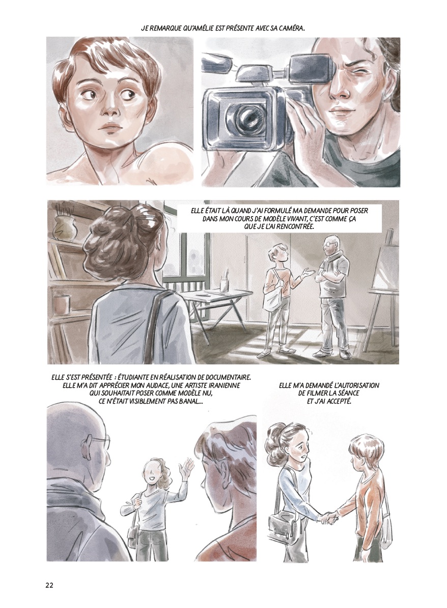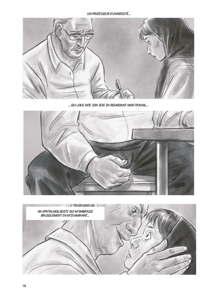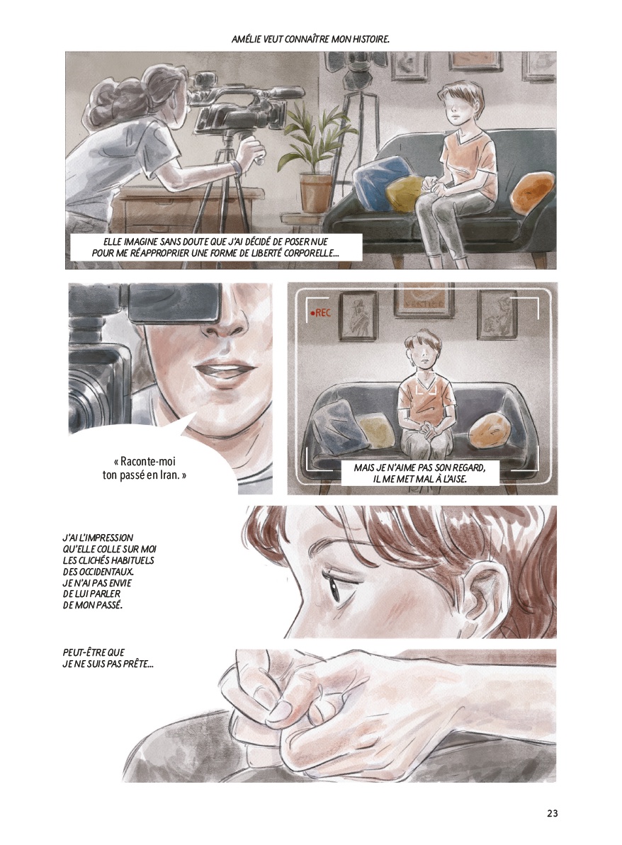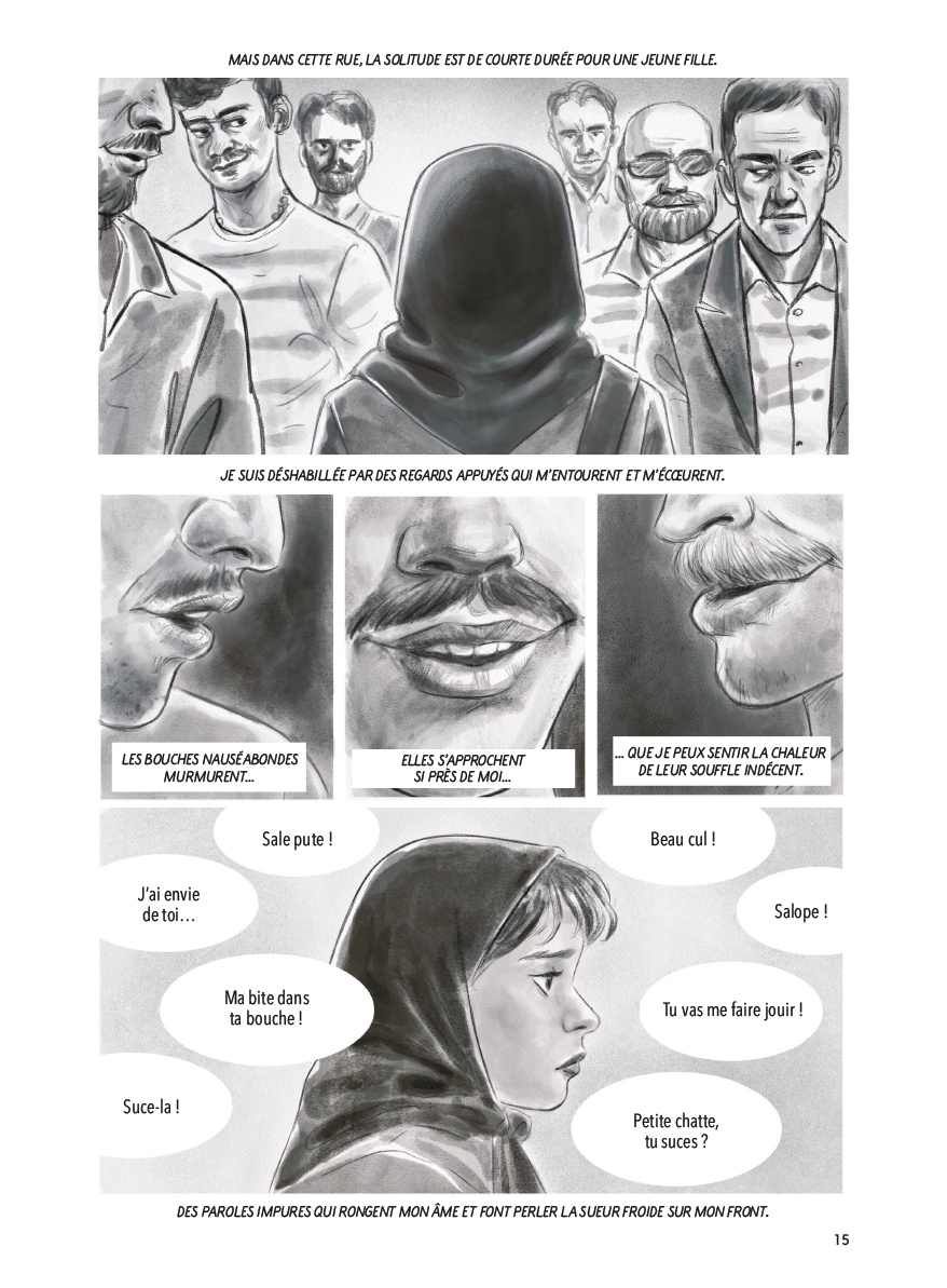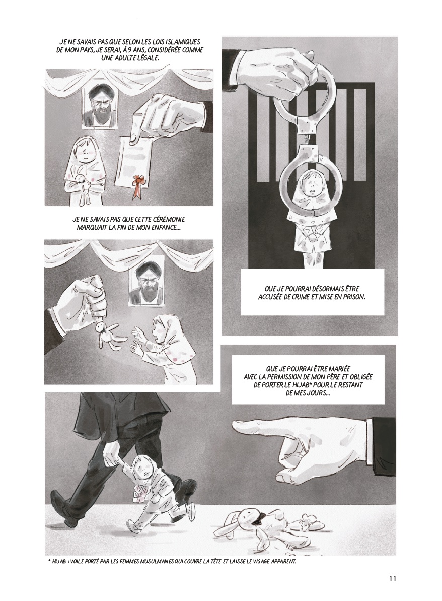 E n Iran, selon la loi islamique, le père de famille est propriétaire du sang de ses enfants, il ne peut donc être poursuivi pénalement s'il s'en prend à sa progéniture. De là découle en partie la construction de la société iranienne où l'homme a les pleins pouvoirs, notamment sur les femmes, en toute impunité. Mansoureh Kamari se souvient ici de son enfance et de son adolescence sous ce joug masculin. Elle expose des faits : les interdictions multiples (rire, chanter, danser, aimer), la possibilité d'être mariée à 9 ans, exécutée à 15, après avoir été violée... Elle raconte les agressions sexuelles répétées, dans la rue, le taxi, chez le médecin, à la fac... Et la peur constante, l'impuissance, l'incapacité à maîtriser son destin. Mais Mansoureh a fuit l'Iran, elle a réussi à sortir de cette oppression permanente, et cet album est aussi l'histoire d'une métamorphose, celle d'une femme recouvrant sa liberté.