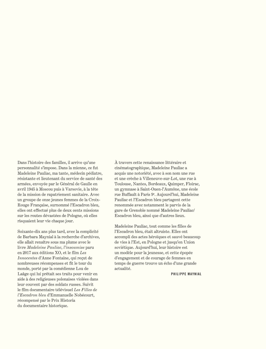 Après les aventures de Madeleine Riffaud - grande résistante et engagée politique, femme de lettres et aventurière -, véritable joyaux de la collection « Aire Libre », la prestigieuse collection des éditions Dupuis accueille l'odyssée d'une autre Madeleine, celle de l'officier médecin Pauliac et de son groupe d'infirmières-ambulancières de l'Escadron bleu. Une oeuvre de la scénariste-romancière Virginie Ollagnier (Ils ont tué Oppenheimer, Nellie Bly) et du dessinateur Yan Le Pon qui adaptent le récit Madeleine Pauliac, l'insoumise de Philippe Maynial, son neveu.