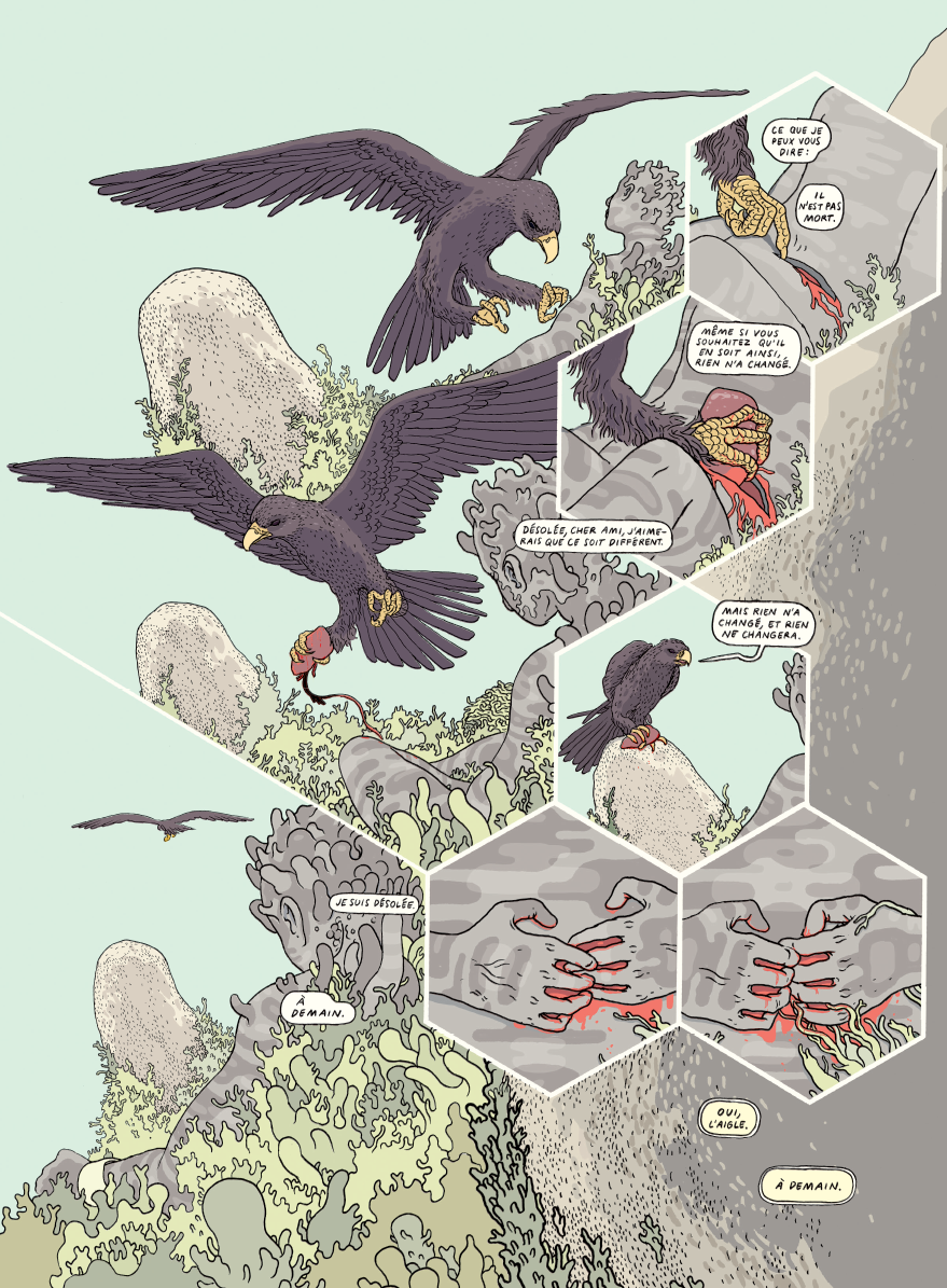 I l est dit qu’un jour les dieux enchaînèrent l’un des leurs sur le mont Caucase, pour le punir d’avoir amené le feu aux humains… Des millénaires plus tard, le supplicié subit toujours la même punition – et, inexorablement, l’aigle, avec lequel il entretient désormais une étrange relation, vient se repaître de son foie. Mais dorénavant, c’est la vengeance qui l’habite.