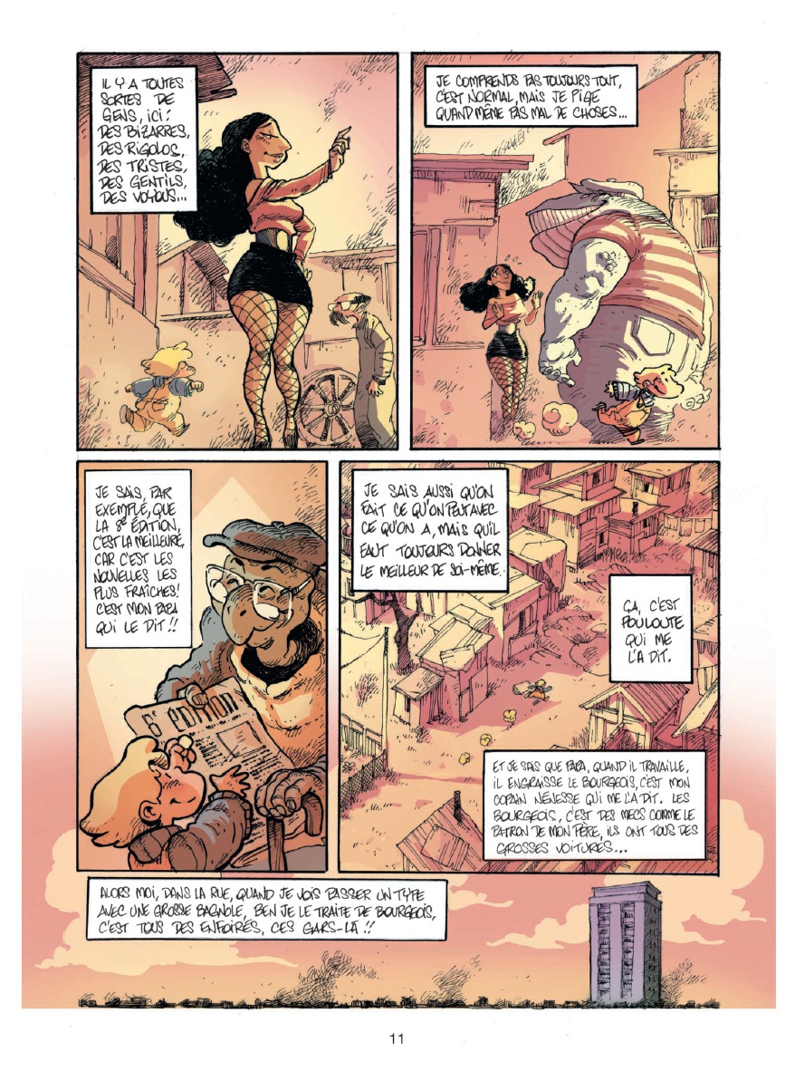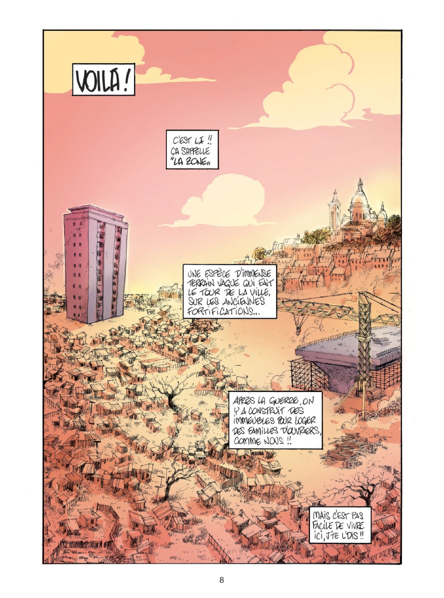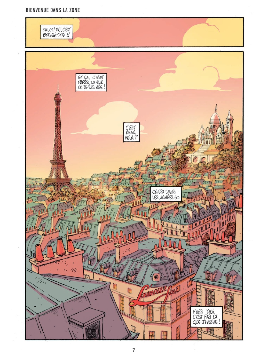 alut, moi c'est Bibi ! J'ai 5 ans ! Ou 8... Je ne sais pas vraiment... Ce dont je suis sûre, c'est que ma vie, c'est un sacré bordel ! D'abord, y a la zone. Une sorte de grand terrain vague où les gens pas riches comme nous s'entassent. On s'y amusait bien, avant la construction du périphérique... Moi, le périph, je l'ai vu grandir ! Après, y a mes copains : Nénesse, le clochard fantastique, érudit et anarchisse ; Pouloute, la grand-mère que j'ai jamais eue ; M'sieur Muguet, l'aveugle au grand coeur...